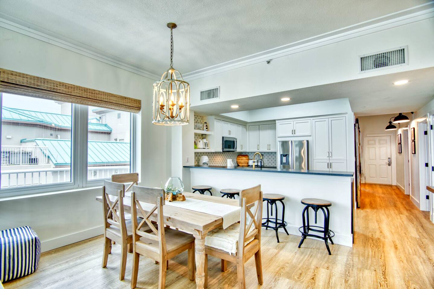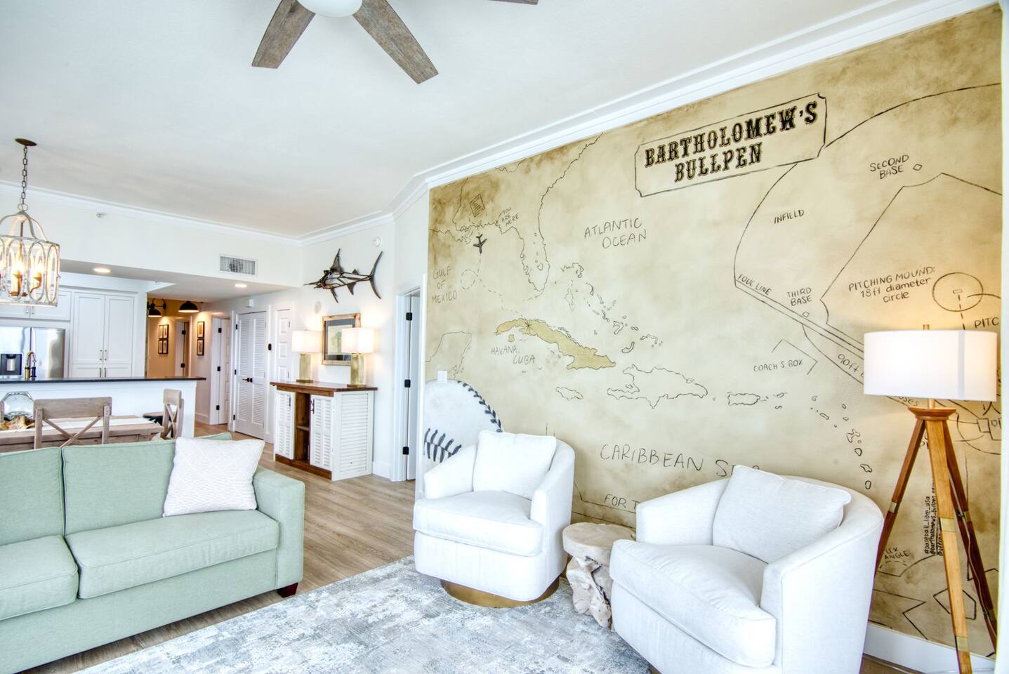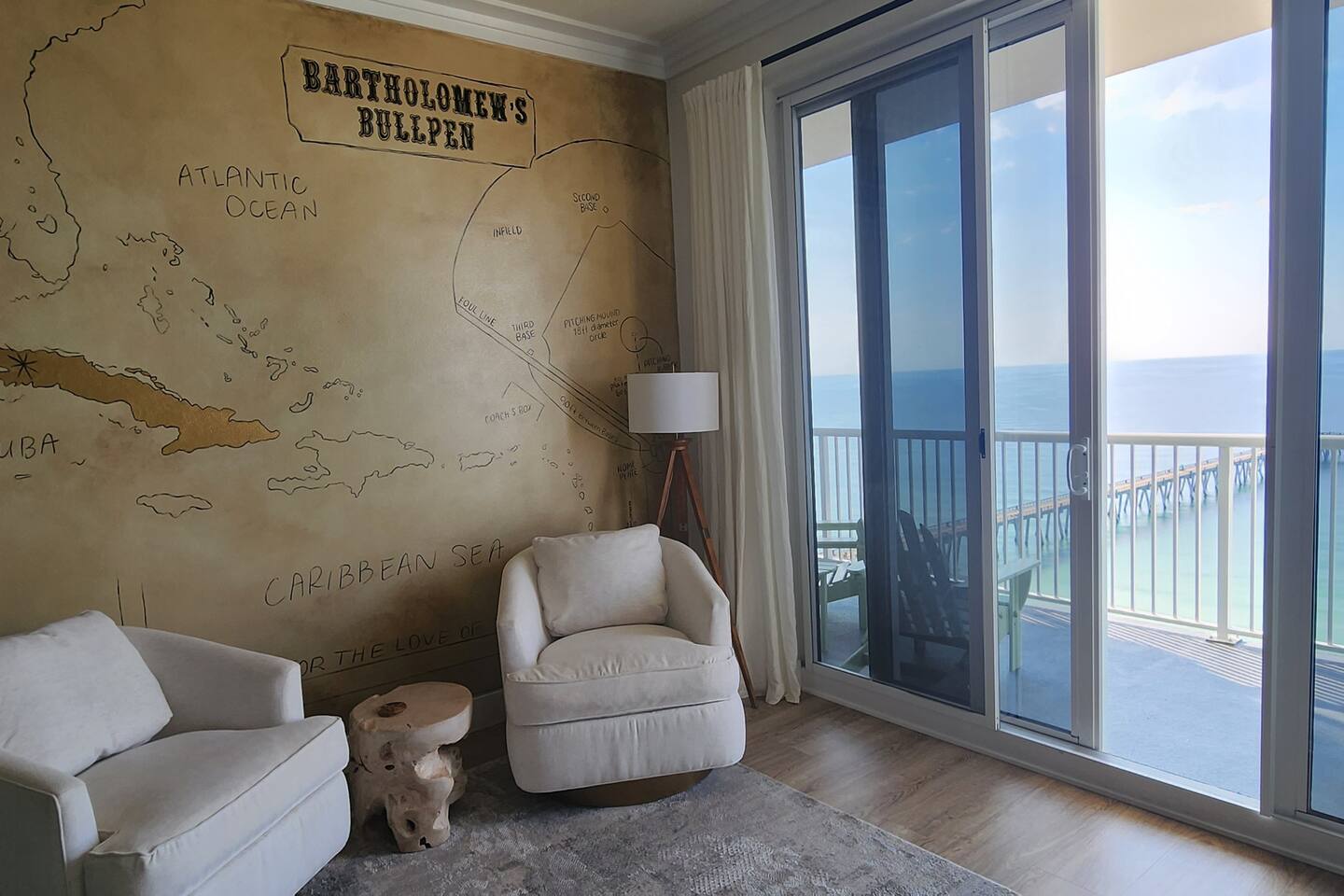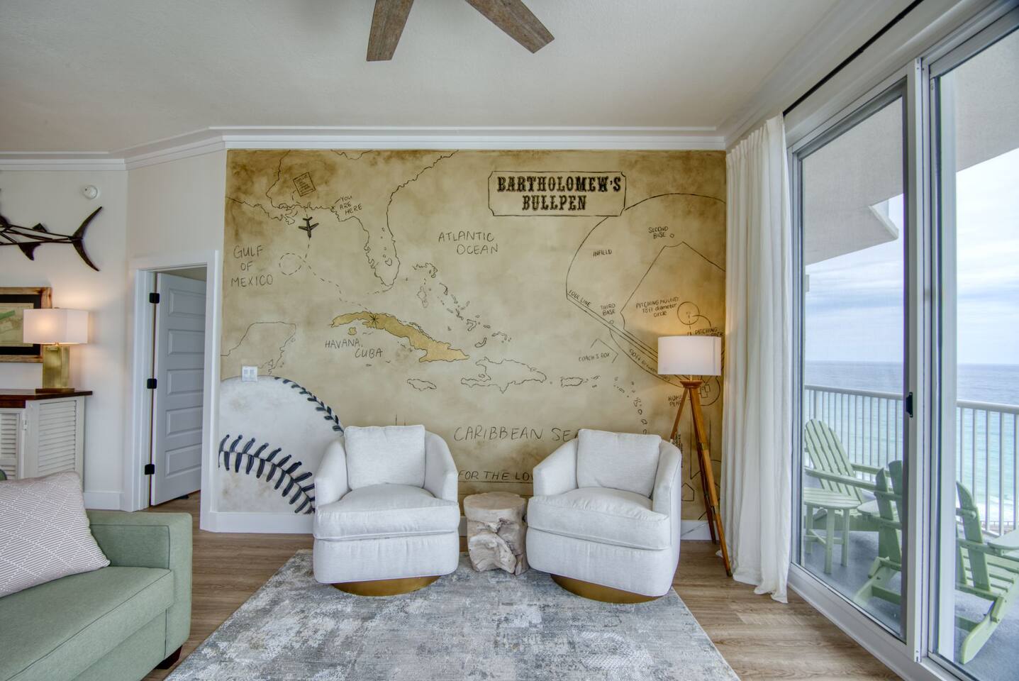 The condo has been thoroughly updated and includes new flooring, kitchen cabinets, countertops, appliances and furniture. You will enjoy the luxurious, subtle coastal vibe with a nod to baseball. Our family's love of baseball inspired a dream to start our non-profit - Baseball Libre. The baseball mural in the main living is intended to spark conversations about the non-profit and bring awareness to our cause which provides equipment and resources to little leagues in Latin America - Havana being the first of many future locations. Every stay at Bartholomew's Bullpen directly funds the mission of Baseball Libre. LIVING - You will find the pull-out queen sofa along with two sitting chairs making it comfortable for you to either enjoy the view of the Gulf of Mexico or a bit of TV. The custom mural completes the space. Motorized woven shades are powered by Alexa. KITCHEN - Brand new kitchen cabinets, countertops, appliances and SMEG small appliances complete this space so you can prepare those fabulous meals. A juicer, blender, coffee maker and coffee grinder along with a milk-shake maker are all included along with all the necessary pots, pans, silverware and dishes you will need! Kitchen bar can seat 4. DINING - Dining table is custom-made in America and is located between the Kitchen and Living area. Seating for 7 comfortably, but the kitchen stools can also be gathered round. PRIMARY BEDROOM - A kick-ass canopy, king-size bed, BOSE soundbar, ROKU TV, direct access to the balcony, large closet, and en-suite make this a space you will never want to leave. Blackout roller shades powered by Alexa will also help you sleep in on vacation if you so desire - or you can open them from bed and enjoy the view! SECOND BEDROOM - Boasting a cozy, queen size bed with retro lamps and local decor. You will also have a flat-panel smart tv where you can login to your favorite streaming services. KIDS BEDROOM - This bedroom has a custom-built, swanky 3-person bunk bed with outlets and USB chargers built in for all the young people's charging needs. BEDDIES are on all the bunk beds and parents (and kids) will love them! The kids will also enjoy a flat-panel smart TV. *Need more space? This unit can now be booked with our other Navarre Beach Luxury Rentals condo located just steps away in the Regency Condo Complex. Sister's Chalet is a 2 bedroom, 2 bath unit that sleeps 8 bringing your total to 17 people with 5 bedrooms and 5 bathrooms plus sleeper sofas in each unit. ** Guests must be at least 25 to book.