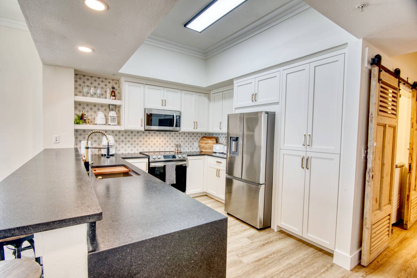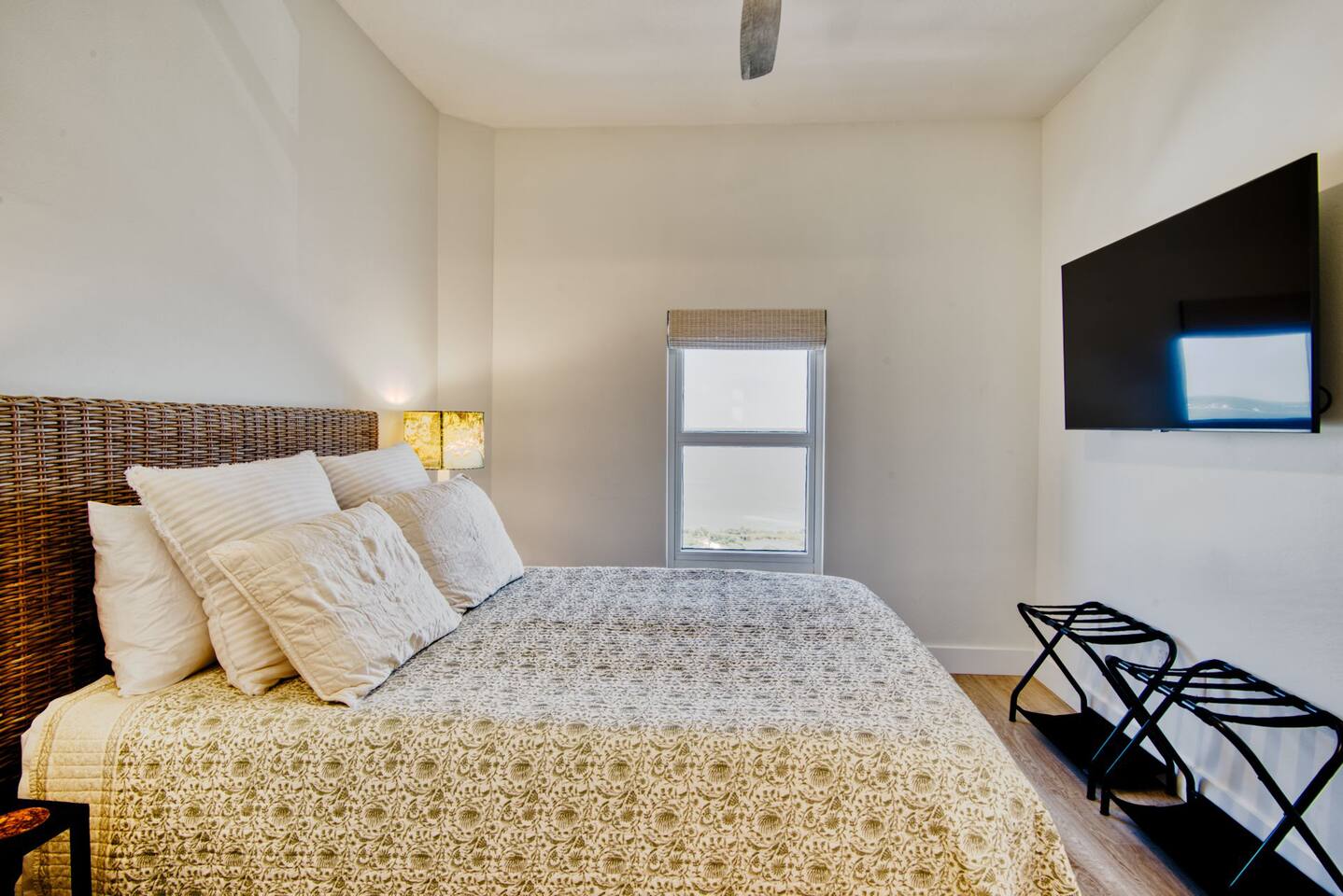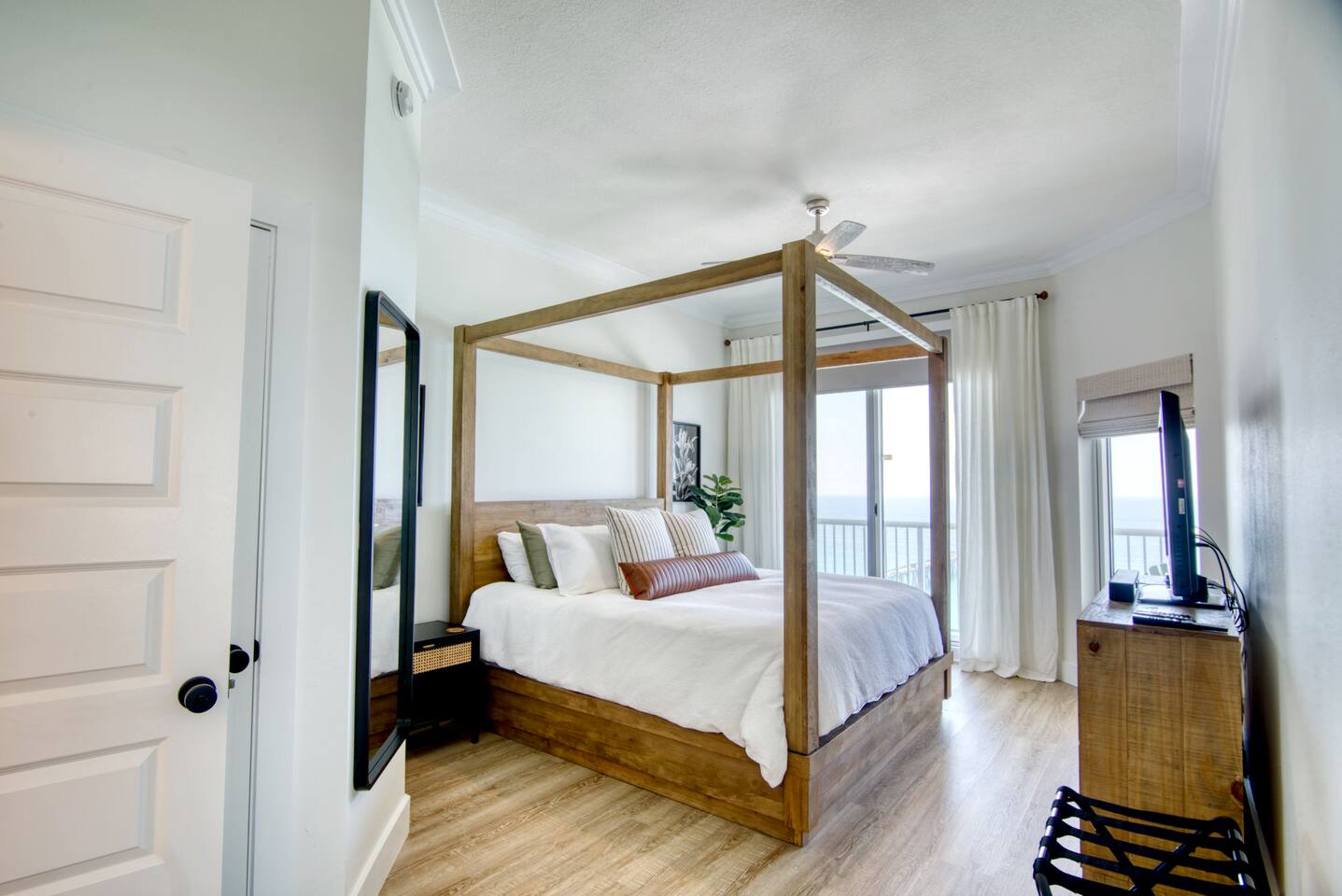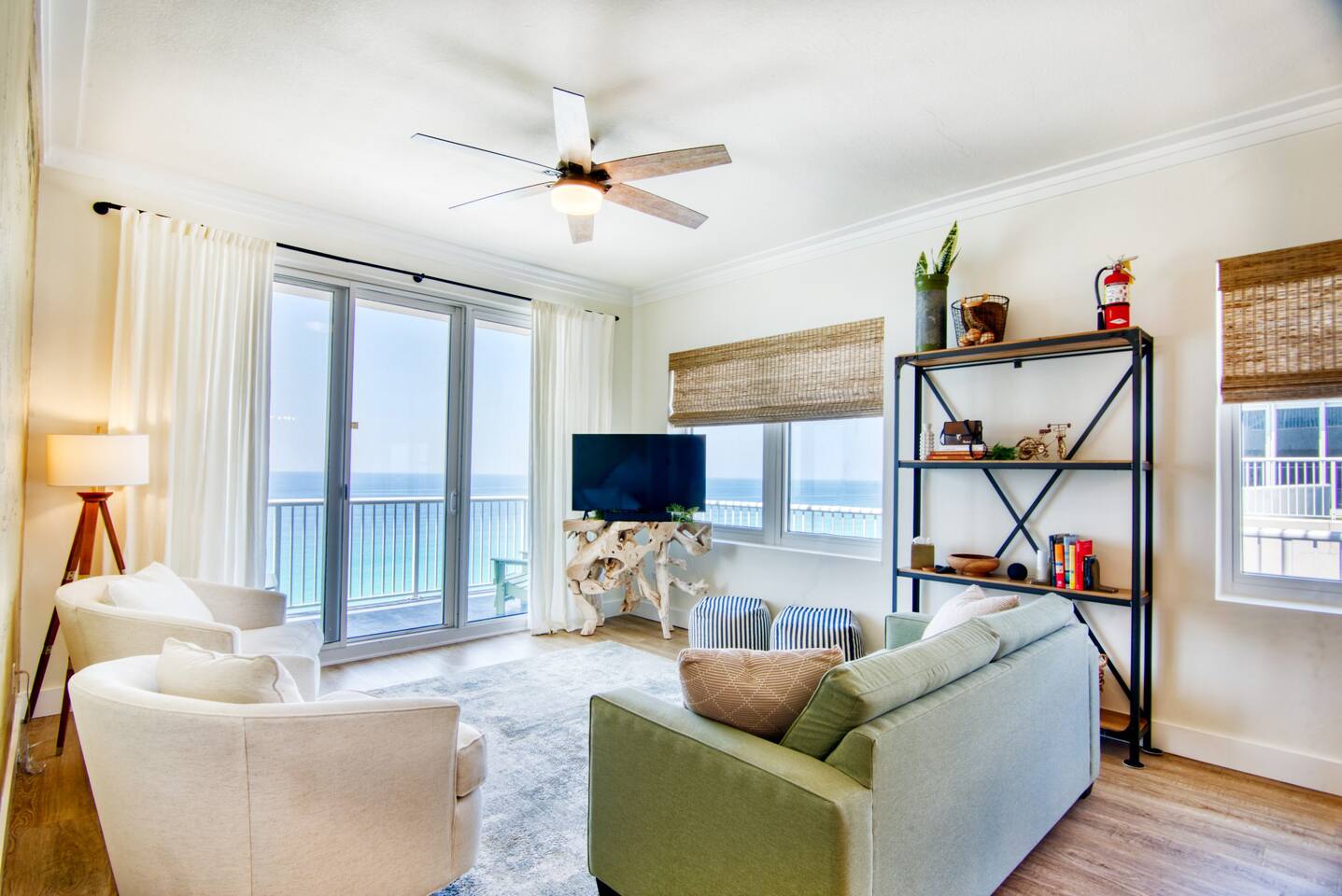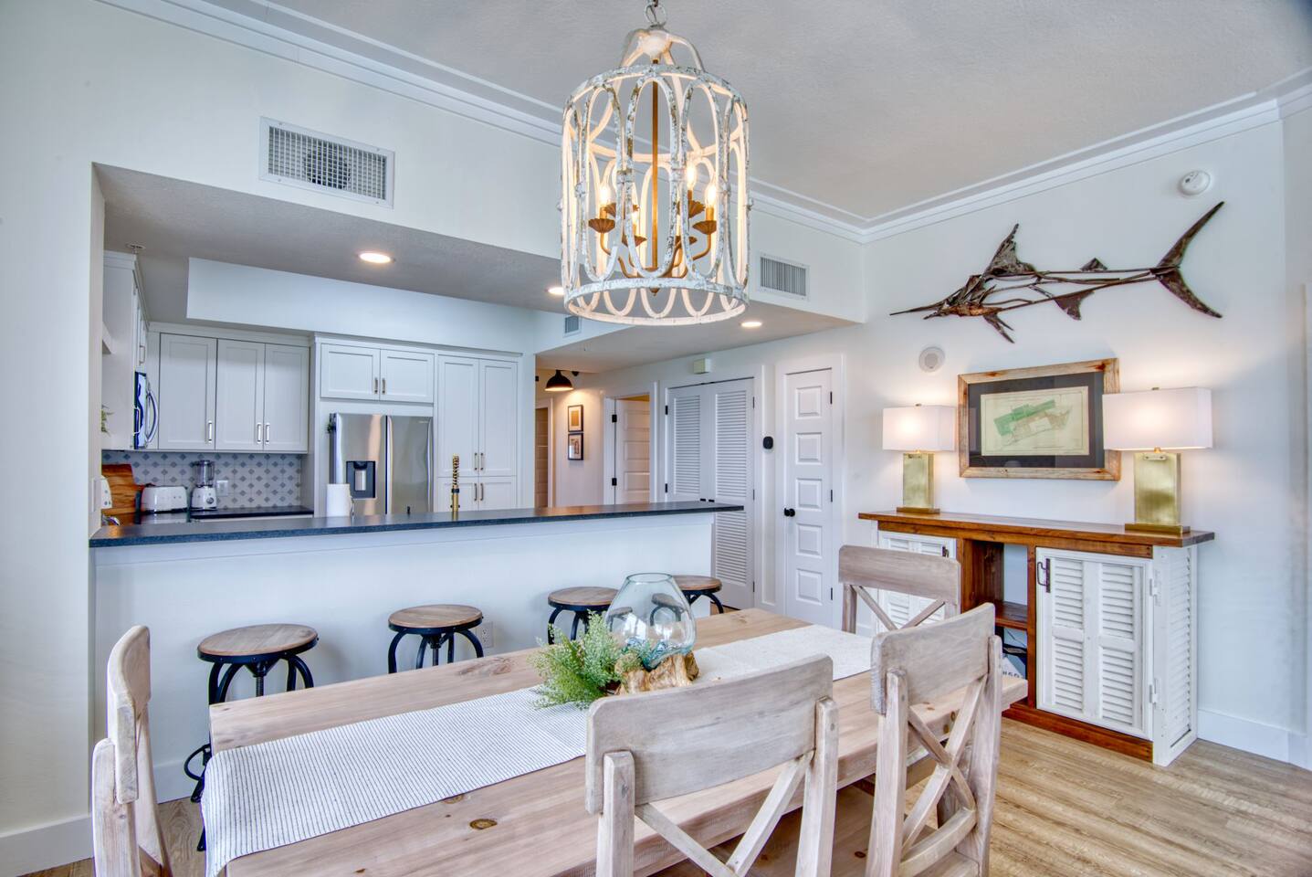The condo has been thoroughly updated and includes new flooring, kitchen cabinets, countertops, appliances and furniture. You will enjoy the luxurious, subtle coastal vibe with a nod to baseball. Our family's love of baseball inspired a dream to start our non-profit - Baseball Libre. The baseball mural in the main living is intended to spark conversations about the non-profit and bring awareness to our cause which provides equipment and resources to little leagues in Latin America - Havana being the first of many future locations. Every stay at Bartholomew's Bullpen directly funds the mission of Baseball Libre. LIVING - You will find the pull-out queen sofa along with two sitting chairs making it comfortable for you to either enjoy the view of the Gulf of Mexico or a bit of TV. The custom mural completes the space. Motorized woven shades are powered by Alexa. KITCHEN - Brand new kitchen cabinets, countertops, appliances and SMEG small appliances complete this space so you can prepare those fabulous meals. A juicer, blender, coffee maker and coffee grinder along with a milk-shake maker are all included along with all the necessary pots, pans, silverware and dishes you will need! Kitchen bar can seat 4. DINING - Dining table is custom-made in America and is located between the Kitchen and Living area. Seating for 7 comfortably, but the kitchen stools can also be gathered round. PRIMARY BEDROOM - A kick-ass canopy, king-size bed, BOSE soundbar, ROKU TV, direct access to the balcony, large closet, and en-suite make this a space you will never want to leave. Blackout roller shades powered by Alexa will also help you sleep in on vacation if you so desire - or you can open them from bed and enjoy the view! SECOND BEDROOM - Boasting a cozy, queen size bed with retro lamps and local decor. You will also have a flat-panel smart tv where you can login to your favorite streaming services. KIDS BEDROOM - This bedroom has a custom-built, swanky 3-person bunk bed with outlets and USB chargers built in for all the young people's charging needs. BEDDIES are on all the bunk beds and parents (and kids) will love them! The kids will also enjoy a flat-panel smart TV. *Need more space? This unit can now be booked with our other Navarre Beach Luxury Rentals condo located just steps away in the Regency Condo Complex. Sister's Chalet is a 2 bedroom, 2 bath unit that sleeps 8 bringing your total to 17 people with 5 bedrooms and 5 bathrooms plus sleeper sofas in each unit. ** Guests must be at least 25 to book.